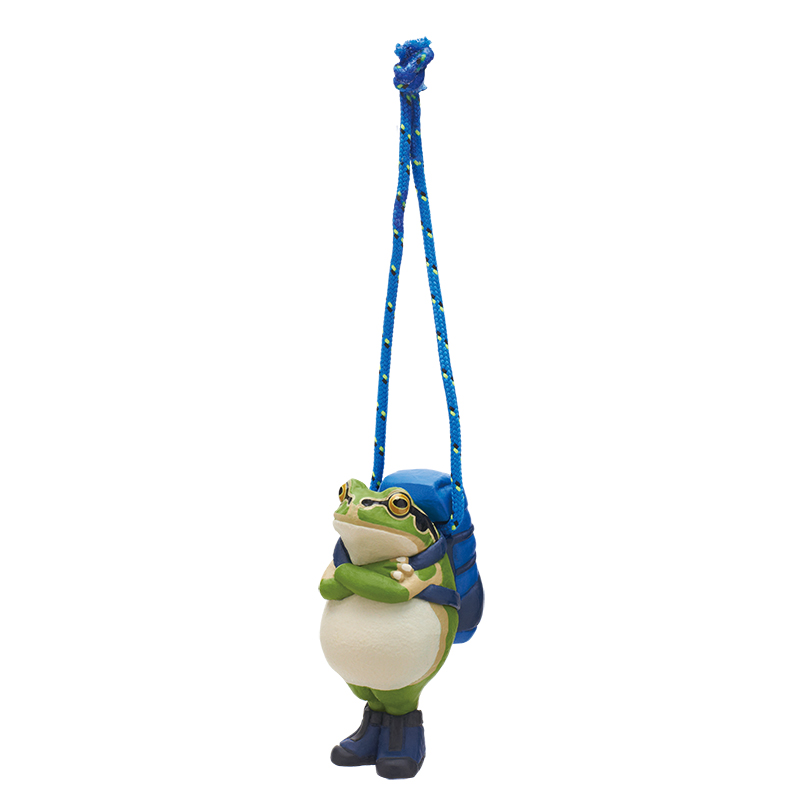 「カエル=帰る」から、無事に家に帰るという想いを込めたマスコット。大きなリュックを背負って、登山靴を履いた蛙たちを作品の雰囲気そのままに再現しました。